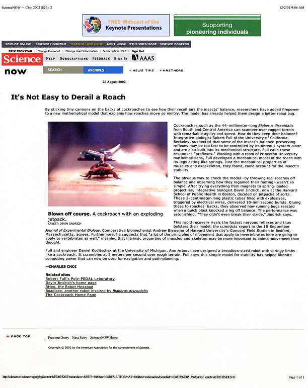 By sticking tiny cannons on the backs of cockroaches to see how their recoil jars the insects' balance, researchers have added firepower to a new mathematical model that explains how roaches move so nimbly. The model has already helped them design a better robot bug. (Scanned article -- JPEG